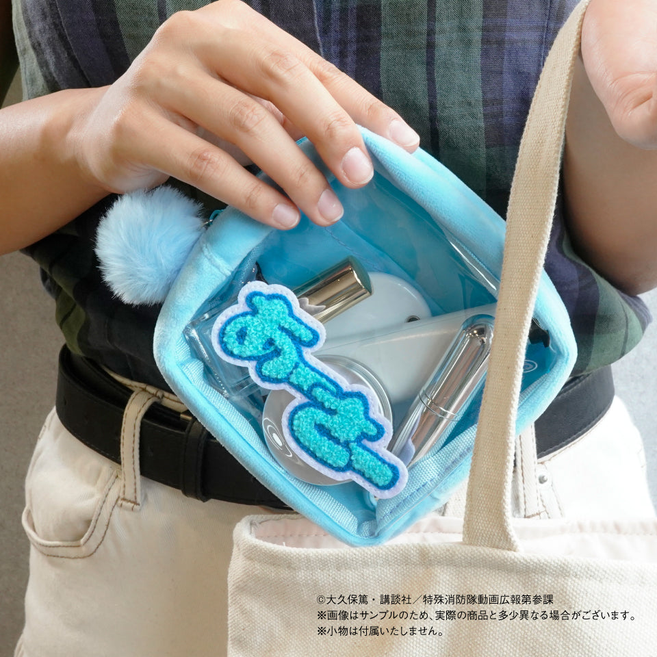 ポーチ中央にキャラクター名、裏面には眠たげな表情のキャラクターのさがら刺繍が施されたスクエアポーチ。