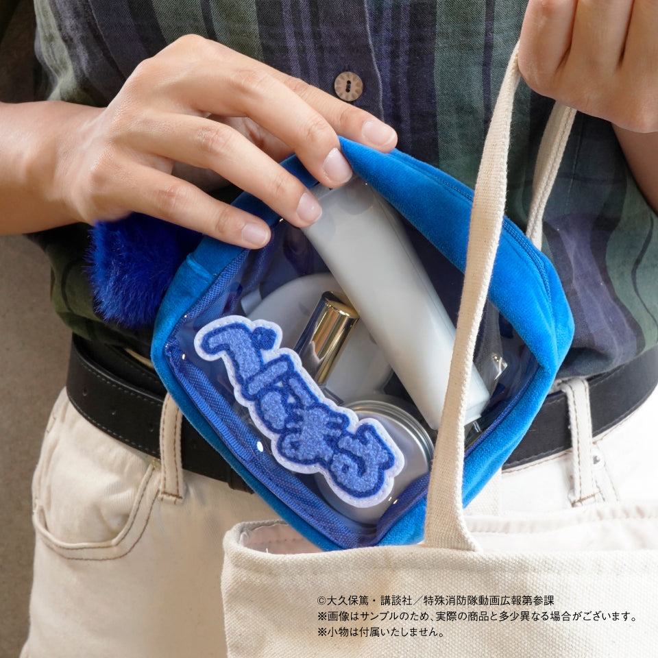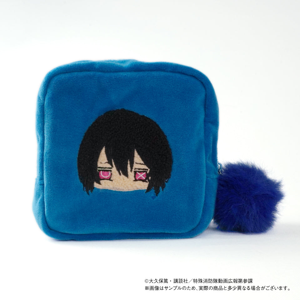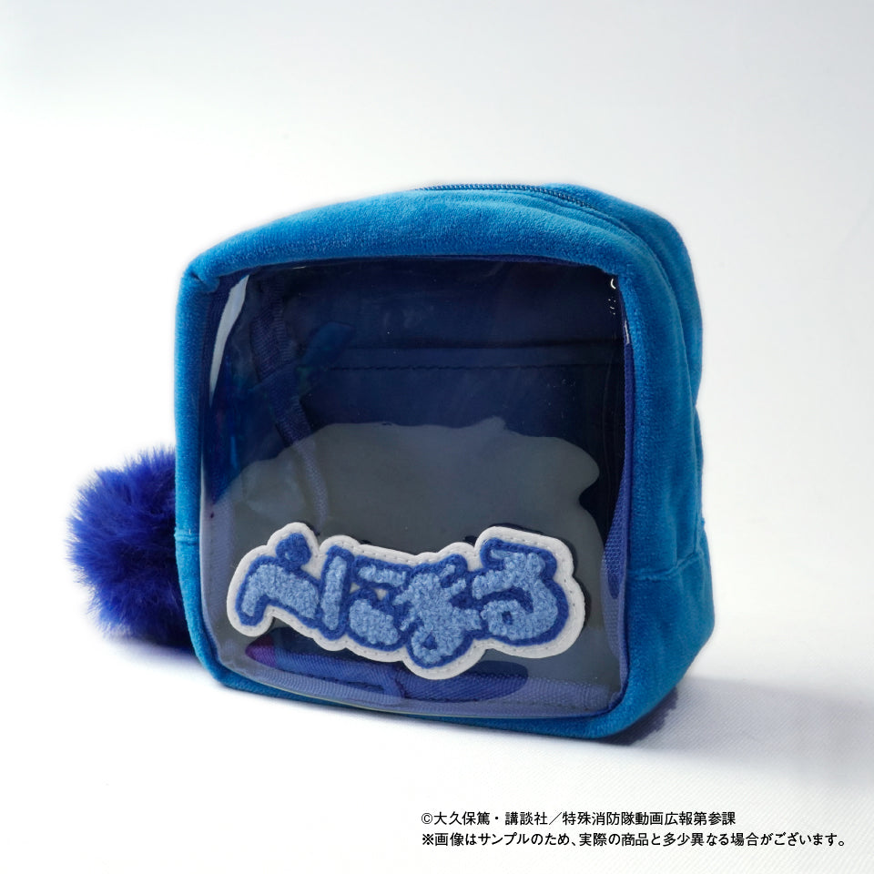 ポーチ中央にキャラクター名、裏面には眠たげな表情のキャラクターのさがら刺繍が施されたスクエアポーチ。
